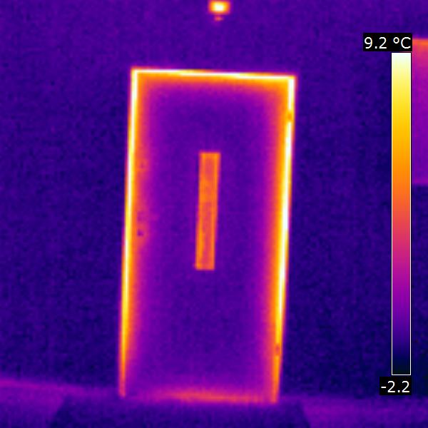 Po przeprowadzeniu wizji lokalnej i wykonaniu zdjęć termowizyjnych szybko znalazła się przyczyna panujących niskich temperatur w wiatrołapie. Otóż budynek został ocieplony w czasie kiedy nie zamontowana była stolarka drzwiowa. Wykonawca przykleił płyty styropianowe do krawędzi otworu drzwiowego a monter drzwi zamontował ramę drzwiową w osi ściany (płyty styropianowe nie nachodziły na ramę drzwiową). W efekcie powstał mostek termiczny i doszło do rozwoju grzybów pleśniowych na ościeżach w pomieszczeniu wiatrołapu. Oczywiście ani jedna ani druga ekipa nie widzi błędu w swoich poczynaniach. Widzi natomiast wszystko „oko” kamery termowizyjnej.